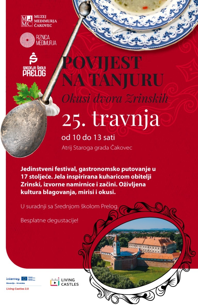 Zaboravite na suhoparne lekcije iz povijesti, u Starom gradu Čakovec prošlost se ovog puta neće čitati već će se kušati. U sklopu projekta Living Castles 2.0, Muzej Međimurja Čakovec i Srednja škola Prelog kao partner, donose jedinstvenu manifestaciju „Povijest na tanjuru – okusi dvora Zrinskih“, ove subote, 25. travnja 2026. g. od 10 do 13 sati u atriju Staroga grada Čakovec koja će vas vratiti u vrijeme raskoši i profinjenih okusa slavne obitelji Zrinski.